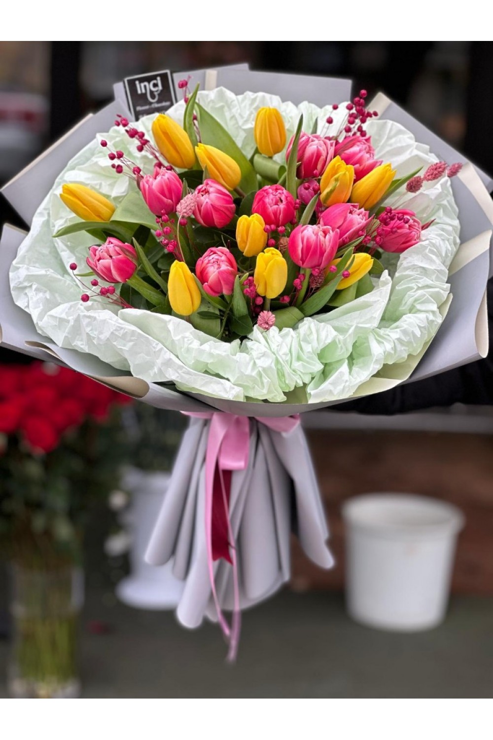 Önemli Not: Çiçekler doğal ürünler olduğu için mevsimsel şartlara bağlı olarak renk tonlarında veya yan ürünlerde (kurdela, ambalaj vb) farklılıklar görülebilir.