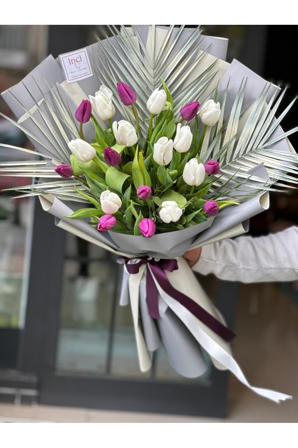 Beyaz Ambalajlı Mor ve Beyaz Lale Buketi