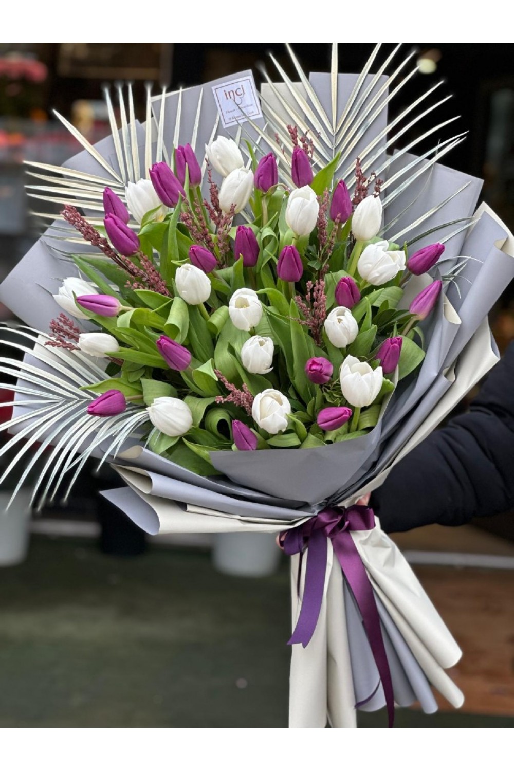 Gri Ambalajlı Beyaz ve Mor Lale Buketi