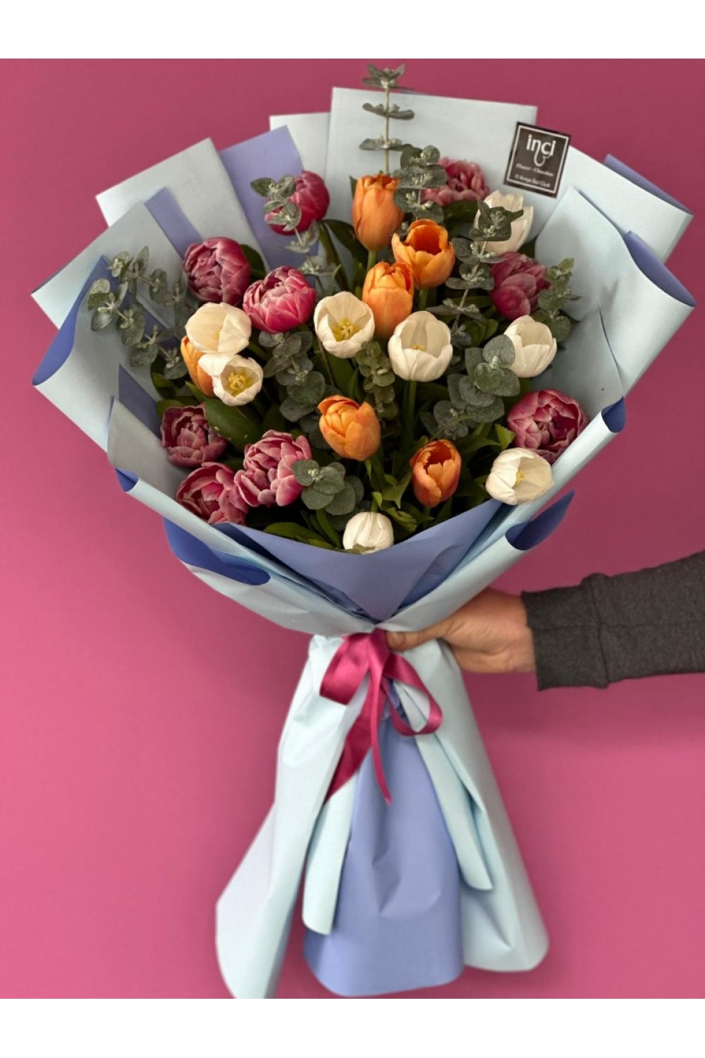 Önemli Not: Çiçekler doğal ürünler olduğu için mevsimsel şartlara bağlı olarak renk tonlarında veya yan ürünlerde (kurdela, ambalaj vb) farklılıklar görülebilir.