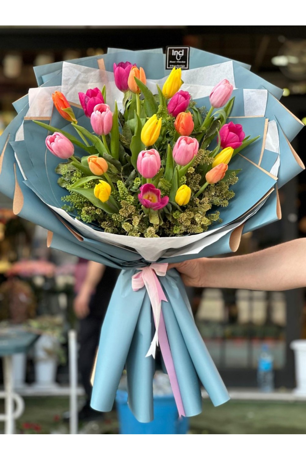 Mavi Ambalajlı Karışık Lale Buketi