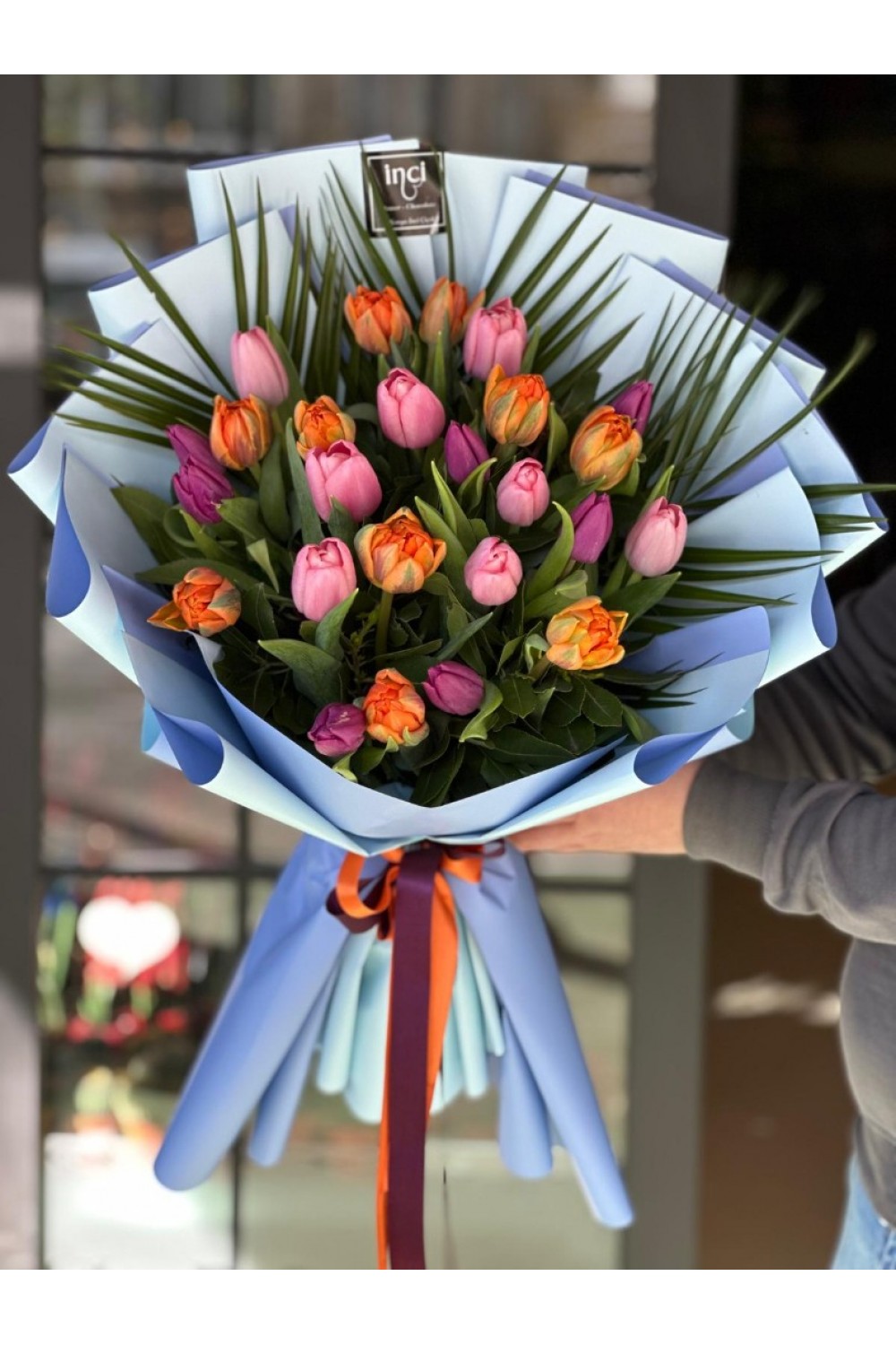 Mavi Ambalajlı Turuncu ve Pembe Lale Buketi