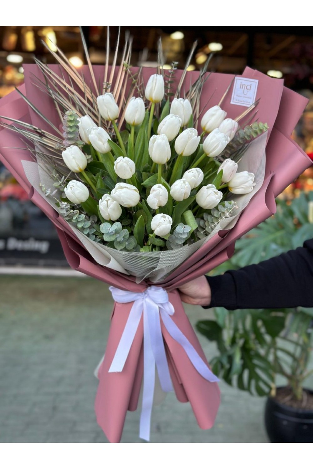 Pembe Ambalajlı Beyaz Lale Buketi