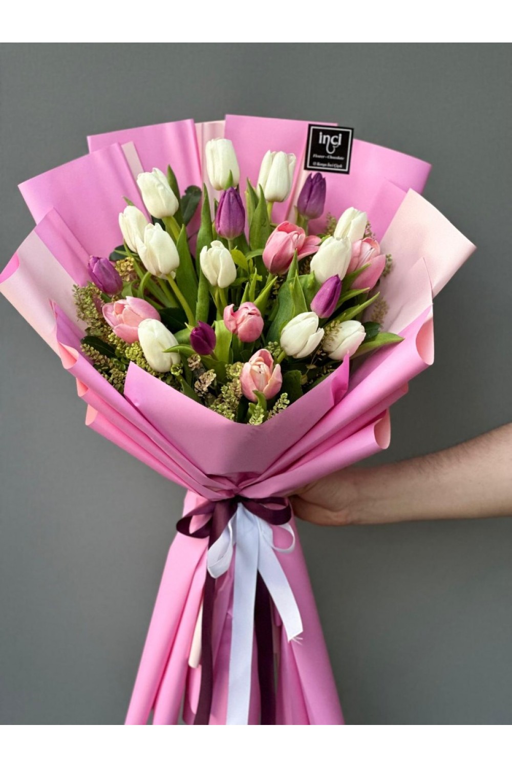 Pembe Ambalajlı Karışık Lale Buketi