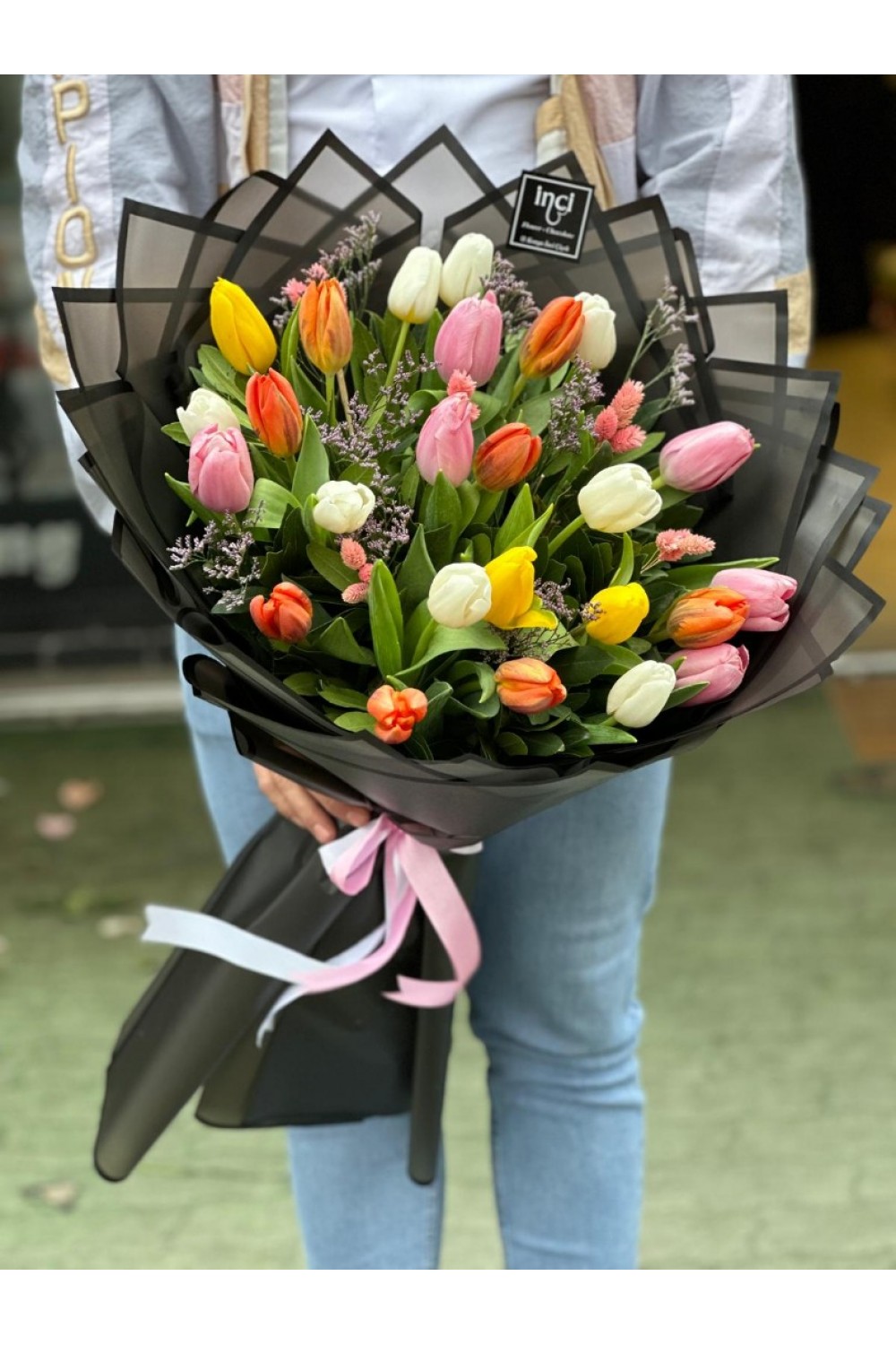 Siyah Ambalajlı Karışık Lale Buketi
