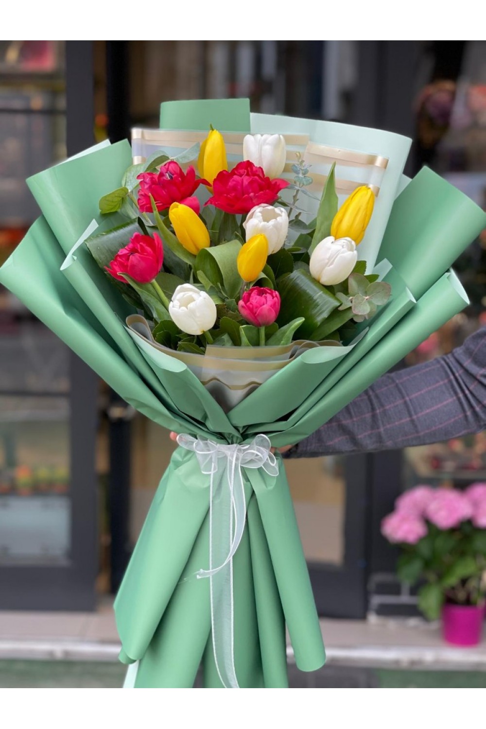 Yeşil Ambalajlı Karışık Renk Lale Buketi